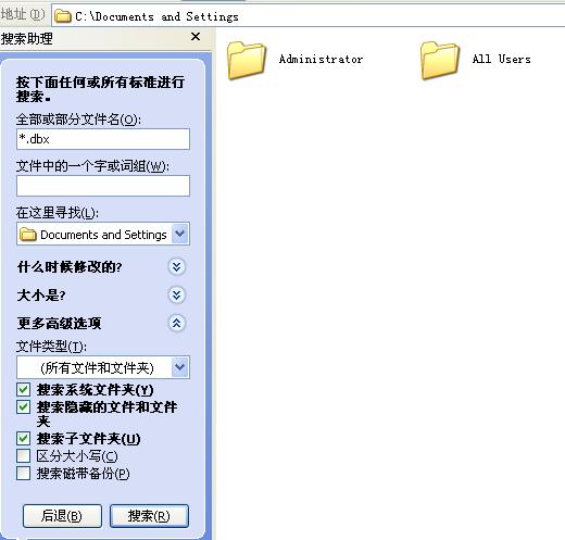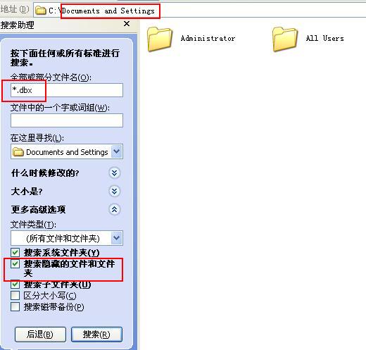 解决办法:在系统盘下的Documents and Settings文件夹下面,搜索*.dbx,注意要在高级选项里勾上“搜索隐藏的文件和文件夹”,如下图: